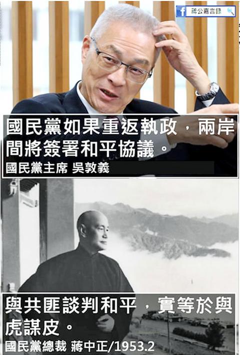 In 1978, the Chinese-language Central Daily News quoted then-KMT chairman Chiang Ching-kuo (蔣經國) as saying in a closed-door KMT meeting that “the party and the government’s unchanging policy is to serve the interest of the nation by fighting the communist bandits to the end. Compromise between nationalists and communists will never exist and there is no peace to speak of thereunto.”