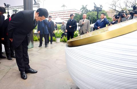 Former president Ma Ying-jeou (馬英九) paid his respects at the 228 Peace Memorial Park in Taipei before visiting an exhibition at the Taipei 228 Memorial Museum, which borders the park.