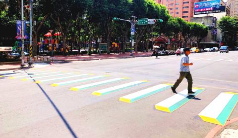 The special markings used in school areas, where white lines are painted over a green crossing, have received a positive response from teachers and parents, who say they are effective in getting drivers to stop, so the city would continue to use such markings in school areas, department Director Liu Ching-feng (劉慶豐) said.
