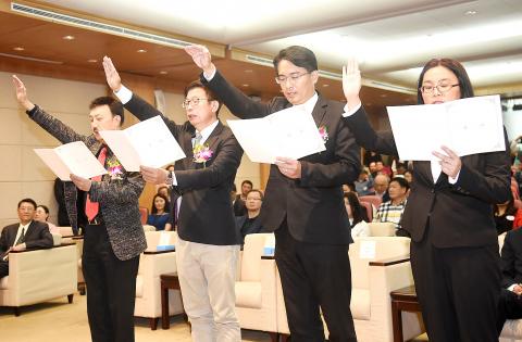 The four winners of the legislative by-elections were sworn in yesterday by Grand Justice Huang Hung-hsia (黃虹霞), with Legislative Speaker Su Jia-chyuan (蘇嘉全) and the caucus whips from the two main political parties attending.