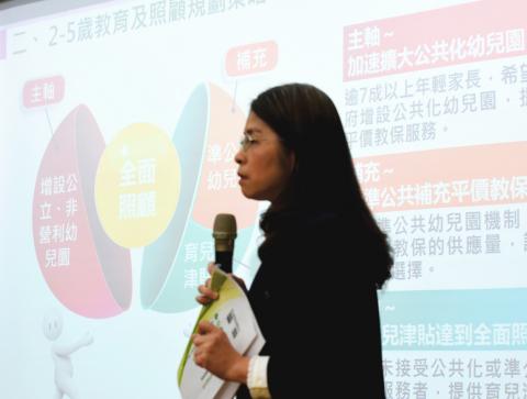 The plan, designed to boost the nation’s birthrate, would ensure affordable childcare for nearly 500,000 children aged five and under by the year 2024, Minister of Education Pan Wen-chung (潘文忠) said.