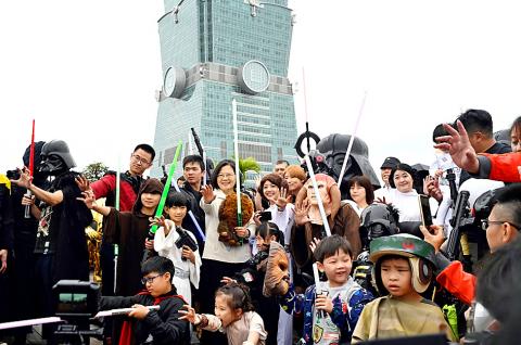 Darth Vader, Chewbacca and a motley crew of intergalactic characters chanted: “May the force be with you” alongside Vice President Chen Chien-jen (陳建仁), while toy-gun-toting stormtroopers joined military police to stand guard outside the landmark in downtown Taipei.