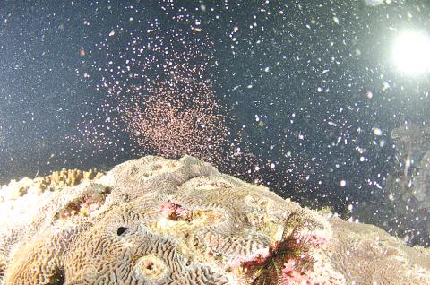 Researcher Allen Chen (陳昭倫) said that he and his colleagues recorded seven types of hermaphrodite coral, which have both male and female sex organs, releasing gametes.