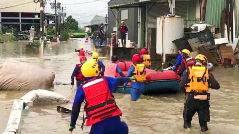 Footage provided by the New Taipei Fire Department showed firefighters rescuing six passengers from a bus half-submerged in flood waters in Linkou District (林口).