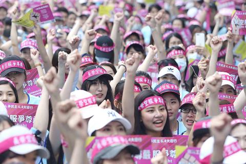 Over the past three decades, EVA’s profit has increased significantly, but the growth has not been reflected in employees’ salaries, union secretary-general Cheng Ya-ling (鄭雅菱) said at a rally in front of the Evergreen International Corp bulding on Minsheng E Road before the march.