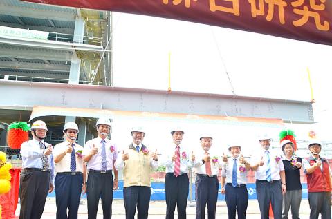 Minister of Science and Technology Chen Liang-gee (陳良基) yesterday attended a beam-raising ceremony for the main building of the Joint Research Center for Green Energy Technologies in Tainan, saying that he expects the center to become a hub for research on green energy generation, preservation and storage.