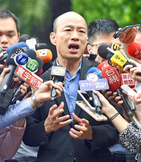 During an inspection tour of Tianliao District (田寮) on Wednesday, reporters asked Han for a comment and he replied: “Currently, for the Republic of China area, we absolutely cannot accept the ‘one country, two systems’ arrangement used in Hong Kong and Macau.”