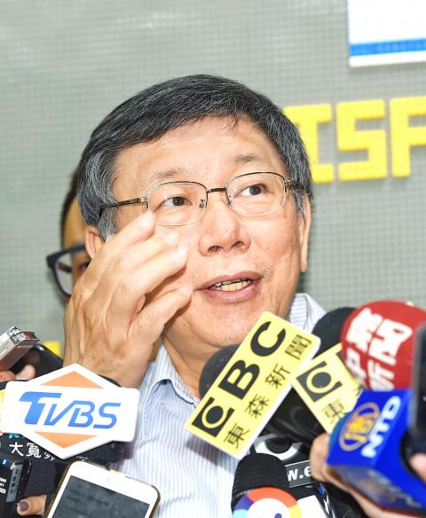 Jokingly describing Tsai and Hon Hai Precision Industry Co chairman Terry Gou (郭台銘), a KMT presidential hopeful, as “two large golden cows,” Ko said that one has the nation’s money and the other his company’s money, which are unlimited, so it is difficult to tell who would win.