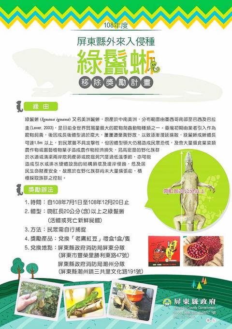 The Pingtung County Government on Tuesday said it is offering a reward for green iguanas, an invasive species that has been eating crops and damaging infrastructure.