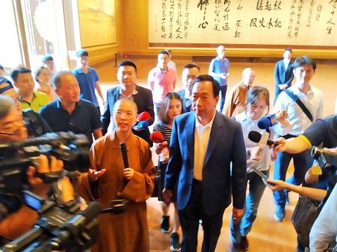 Gou, who resigned on Friday last week as company chairman to pursue the Chinese Nationalist Party’s (KMT) nomination for next year’s presidential election, made the claim when leaving Kaohsiung’s Fo Guang Shan Buddha Museum to visit the Fo Guang Shan Sutra Repository.
