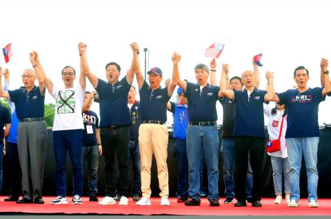 Many attendees waved Republic of China (ROC) flags or banners expressing support for former New Taipei City mayor Eric Chu, (朱立倫), Hon Hai Precision Industry Co founder Terry Gou (郭台銘) or Kaohsiung Mayor Han Kuo-yu (韓國瑜), contenders in the party’s presidential primary.