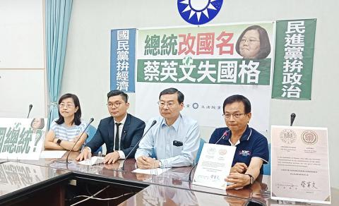 “Tsai is gradually moving toward her goal of changing the nation’s title from the Republic of China (ROC) to Taiwan, and is planning to scrap the ROC,” he said. “The KMT caucus condemns her in the strongest terms. We urge her to apologize to the public and pull out of next year’s presidential election, for she is no longer qualified to run.”