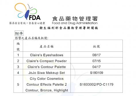 Under the Cosmetic Hygiene and Safety Act (化妝品衛生安全管理法), cosmetics companies whose products are found to contain banned ingredients could be fined NT$20,000 to NT$5 million (US$642 to US$160,462), with the possibility of consecutive fines, the agency said.