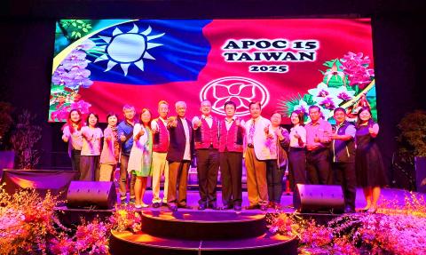 The text “APOC 15 Taiwan 2025” along with an image of the Republic of China flag and pictures of Taiwanese orchids were displayed on a screen at the 13th APOC held at the Borneo Convention Centre Kuching in Sarawak, Malaysia.