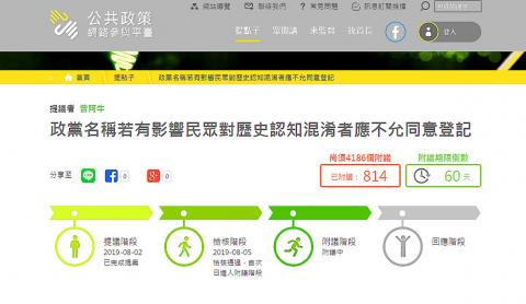 From its launch on Friday last week to press time last night, the petition had gathered 1,115 signatures. It must collect 5,000 signatures by Oct. 5 to require the government to issue an official response, according to join.gov.tw.