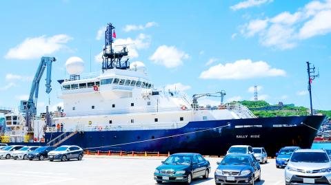 The US’ Sally Ride, its newest research vessel, berthed at the Port of Keelung on Thursday as it makes its way to international waters near Palau with a research team that includes faculty and students from National Taiwan University’s Institute of Oceanography.