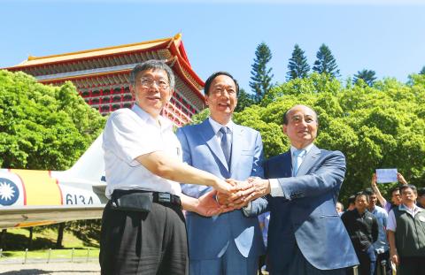 Taipei Mayor Ko Wen-je (柯文哲), Hon Hai Precision Industry Co founder Terry Gou (郭台銘), and Chinese Nationalist Party (KMT) Legislator Wang Jin-pyng (王金平) appeared together in public for the first time yesterday amid speculation that they are planning to team up against Taiwan’s two major parties in next year’s presidential and legislative elections.