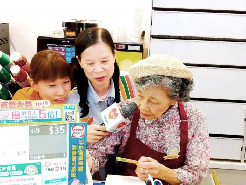 Four older people from the foundation — 84-year-old Kuo Chun (郭春), 81-year-old Lee Chin-ying (李金英), 77-year-old Hsu Chou Yu-yeh (許周玉葉) and an unnamed senior — recently began working 10:30am to 11:30am every Friday at a 7-Eleven store in Taipei, the company said.
