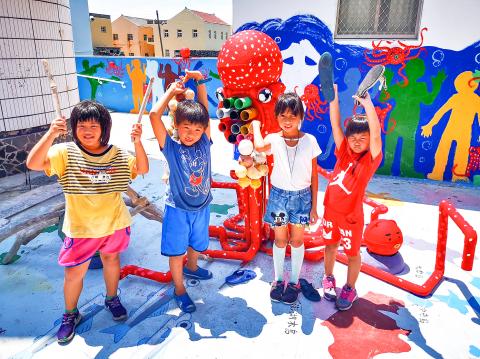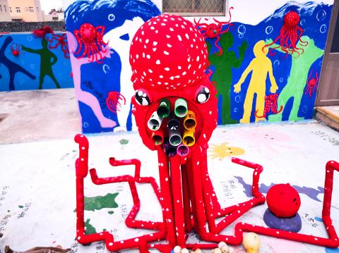The school — the only elementary school on the island — organized an art project for students with the theme “technology and marine ecology,” and invited local artist Bruce Wu (吳成夫) to advise students on making art out of trash.