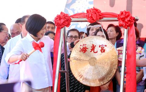 After a cultural event at the Haiguang Temple (海光宮) in Shilin District (士林), Tsai visited the Tamsui (淡水) Presbyterian Church in New Taipei City.