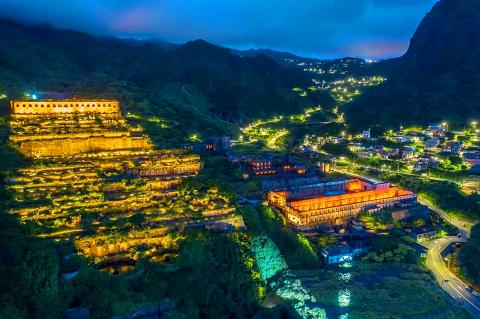 The Shuinandong (水湳洞) smelter in New Taipei City’s Rueifang District (瑞芳) was lit up on Friday to boost local tourism.