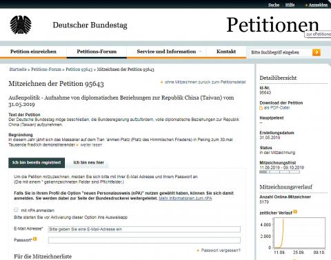 The petition asks the Bundestag to ask the German Cabinet to establish formal relations with the Republic of China (Taiwan).