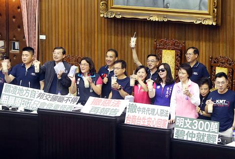 The KMT caucus demanded that the “malignant law” targeting CCP agents be retracted and that President Tsai Ing-wen (蔡英文) deliver a report to the Legislative Yuan on the cigarette smuggling incident.
