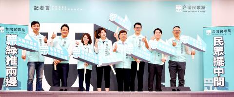 Chanting “Push the pan-blue and pan-green camps to the two sides and put the people in the middle,” the candidates joined Taipei Mayor Ko Wen-je (柯文哲), the party’s chairman, as he made a public appearance in Taipei.