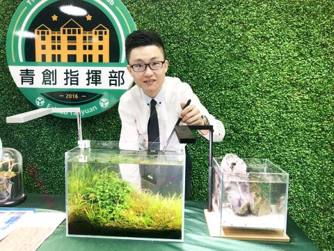 Aquarium designer and award-winning shrimp breeder Wang Chun-yi’s (王君懿) creations are being exhibited at the aquaculture section of the Taoyuan Agriculture Expo, which opened on Saturday.