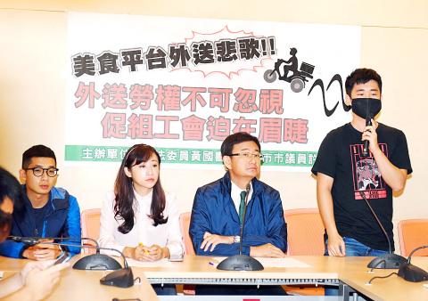 Lin Chia-wei (林佳瑋), a New Power Party (NPP) legislative candidate for Taoyuan, told a news conference at the Legislative Yuan in Taipei that although the agency categorizes Foodpanda and Uber Eats deliverers as employees, it has not established a clear set of standards that can be applied to other delivery companies.