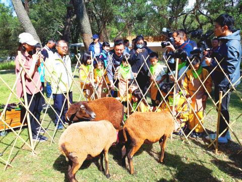 Students from Hsinchu Elementary School hand-picked sweet potato leaves from the food forest and were taught by zoo staff how to feed the sheep, the Hsinchu City Government said.