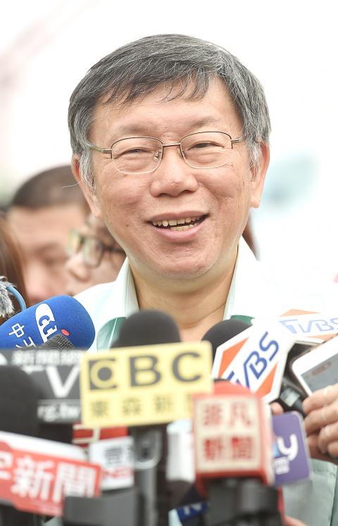 Ko said that he had been discussing with his aides about what pleasantries to put on flowers he would send to Soong’s news conference, finally deciding on the Chinese idiom “stride fearlessly forward” (勇往直前).