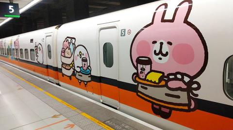 The Taiwan High-Speed Rail Corp (THSRC) yesterday officially launched a new theme train from Taipei, with the train’s exterior featuring two popular cartoon characters created by Japanese illustrator Kanahei.