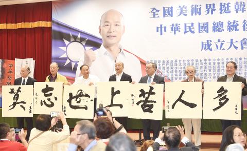 The group presented Han with two calligraphy works — one reading “defeating thousands of enemies” (橫掃千軍) and the other, “commoner president” (庶民總統).