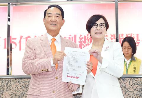 People First Party (PFP) Chairman James Soong (宋楚瑜) and former United Communications Group chairwoman Sandra Yu (余湘) yesterday registered as the party’s presidential and vice presidential candidates at the Central Election Commission in Taipei.