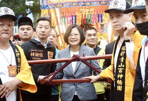 Accompanied by independent Legislator Freddy Lim (林昶佐) and Minister of the Interior Hsu Kuo-yung (徐國勇), Tsai helped carry a palanquin at the temple, which was holding a three-day procession to celebrate the birthday of its mountain god.