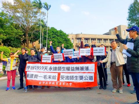 Former school employees yesterday protested outside the Executive Yuan and the ministry, accusing the ministry of failing in its duties and calling for the school to compensate them for salary owed, severance payments and civil servant insurance payouts.