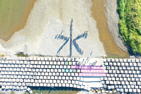 The protesters stood on the riverbank to form the Chinese character for the word “water” (水, shui), and captured the scene using a drone.