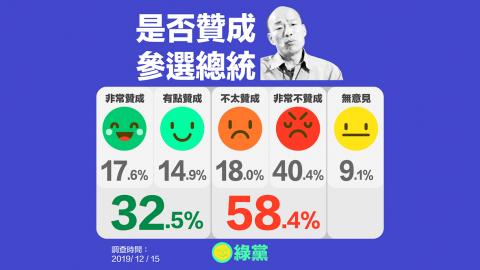 The poll, for which 1,009 residents aged 20 and older were interviewed on Sunday, found that 58.4 percent disapprove of Han running for president, compared with 32.5 percent who approve.