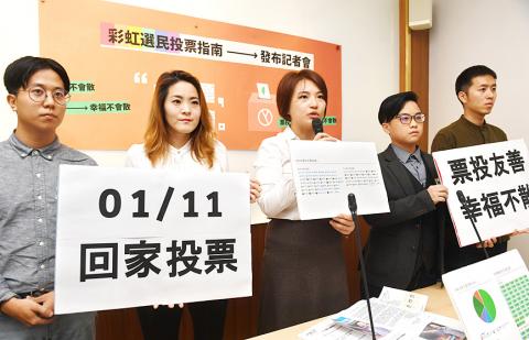 The coalition, composed of five gender equality groups, told a news conference in the Legislative Yuan in Taipei that it has posted guidelines for “rainbow voters” on PrideWatch, a Web site that records remarks made by presidential and legislative candidates, and how they voted in the same-sex marriage bill in May.