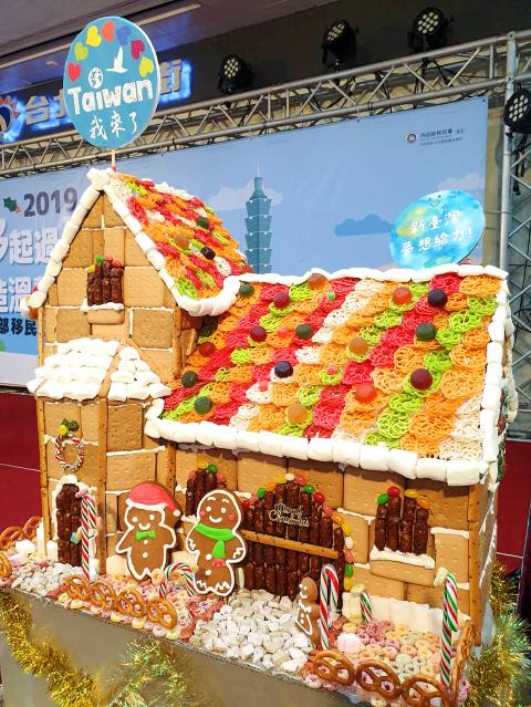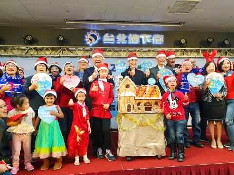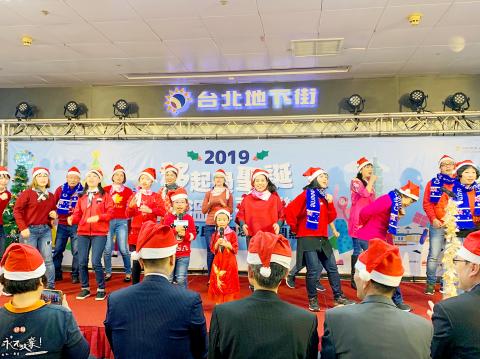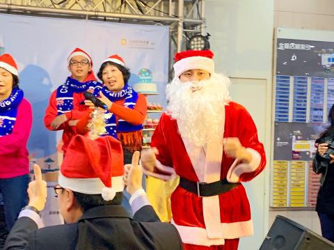 Participants sang: “The north wind is screaming, who is hiding, a bag of gifts that Santa Claus is carrying” — the Taiwanese lyrics of a Christmas song — in a presentation held by the Ministry of the Interior’s National Immigration Agency at Taipei Main Station yesterday.