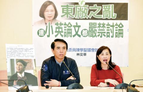 For example, a National Chengchi University professor, identified only by the initial of their surname, “L,” has said on Facebook that a former classmate’s mother was questioned by police after sharing an online post questioning the authenticity of President Tsai Ing-wen’s (蔡英文) doctoral dissertation, KMT Legislator Apollo Chen (陳學聖) told a news conference at the Legislative Yuan in Taipei.