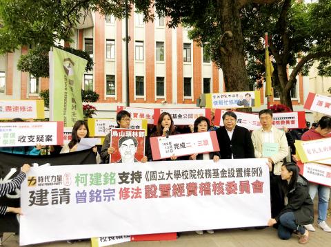 The group, which included New Power Party Legislator Cheng Hsiu-ling (鄭秀玲), said that an unbiased system for budget auditing is necessary for a democratic academic environment, and the government should amend the legislation regulating how public universities use academic funds and make establishing a budget auditing committee a legal responsibility.