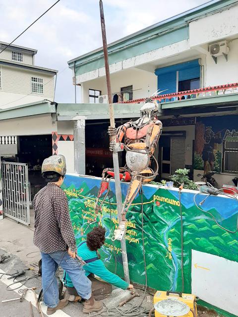Two artists, inspired by the culture and spirit of Taiban Village in Taitung County’s Daren Township (達仁), have created a series of “robot warrior” sculptures using recycled material and scrap collected in the village.