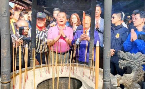 During a visit to Zihnan Temple (紫南宮) in Nantou County, Soong said that Hon Hai Precision Industry Co founder Terry Gou (郭台銘) was also in Taichung, as both of them were sharing campaign work ahead of Saturday’s elections.
