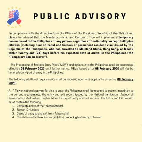 From Saturday, Taiwanese who want to visit the Philippines would be asked to provide a recent travel history when applying for a visa following the extension of a travel ban on foreign travelers who have been to China or its special administrative regions within the previous three weeks, the Manila Economic and Cultural Office said on Tuesday.