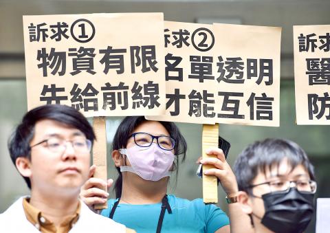 Representatives from several groups yesterday gathered outside the Centers for Disease Control’s office in Taipei to urge the government to protect the nation’s medical staff and resources as the fight against the 2019 novel coronavirus outbreak continues.
