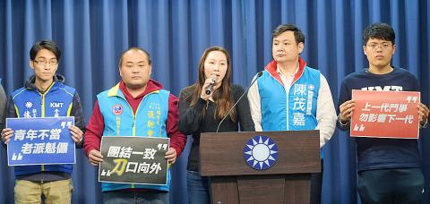 Lin Hsing-er (林杏兒), head of the Chinese Nationalist Party’s (KMT) Department of Youth Affairs, yesterday called for an end to infighting after former KMT secretary-general King Pu-tsung (金溥聰) joined party members opposed to the reinstatement of Independent Legislator Fu Kun-chi’s (傅崐萁) membership.