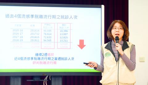 There were 12,059 emergency room visits for flu-like illness reported last week, down 4.4 percent from a week earlier, CDC Epidemic Intelligence Center Director Liu Ting-ping (劉定萍) said, adding that there were 46,433 hospital visits for flu-like illness reported, down 11.6 percent week-on-week.