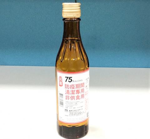 The company sells four types of 75 percent alcohol solution for disease prevention: a 600ml glass bottle with no spray top at NT$75, a 300ml glass bottle with no spray top at NT$40, a 500ml plastic bottle with a spray top at NT$100 and a 60ml plastic bottle with a spray top at NT$50, TTL vice president Liao Chih-chien (廖志堅) said.